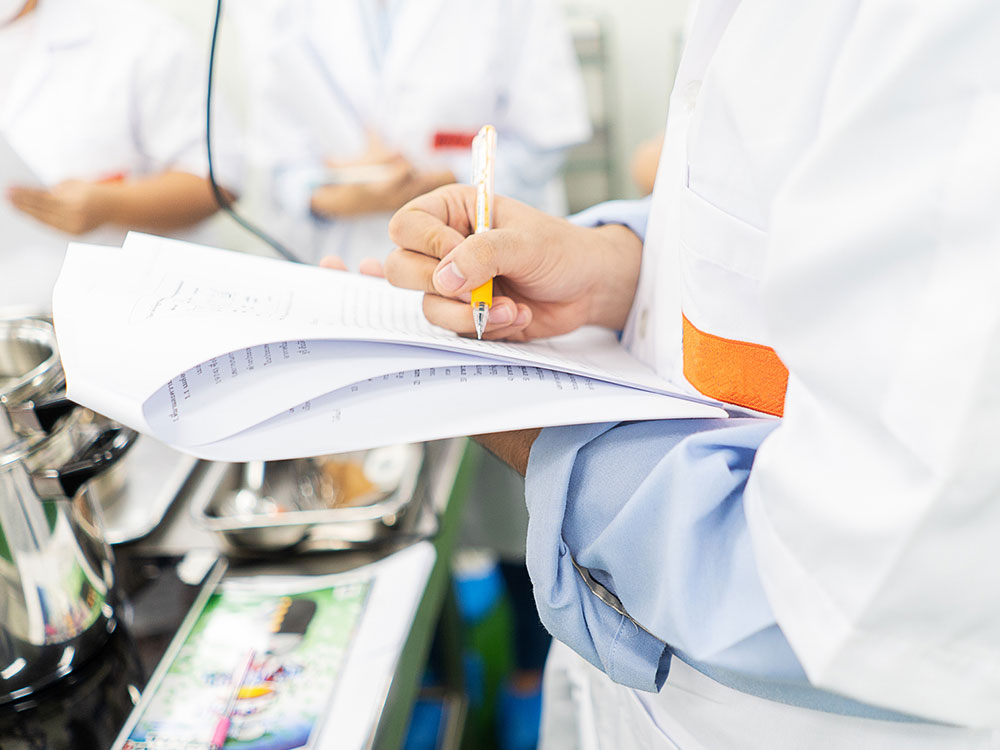 健康管理:毎日健康状態をチェックし記録しております。調理従事者だけでなく同居家族の健康状態も確認。下痢・嘔吐・発熱のある場合は出勤せず、陰性確認後に出勤